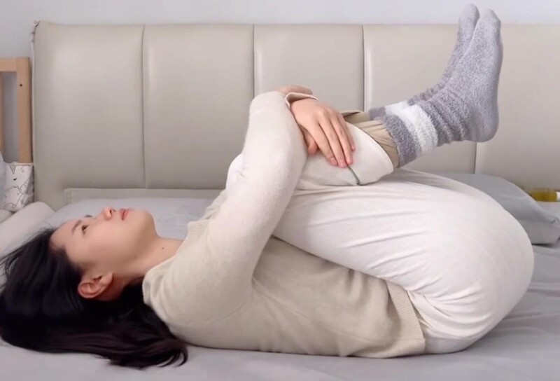 平躺,双腿抬起,双手抱膝,往胸前方向靠近,保持3秒,就会打嗝排气啰!